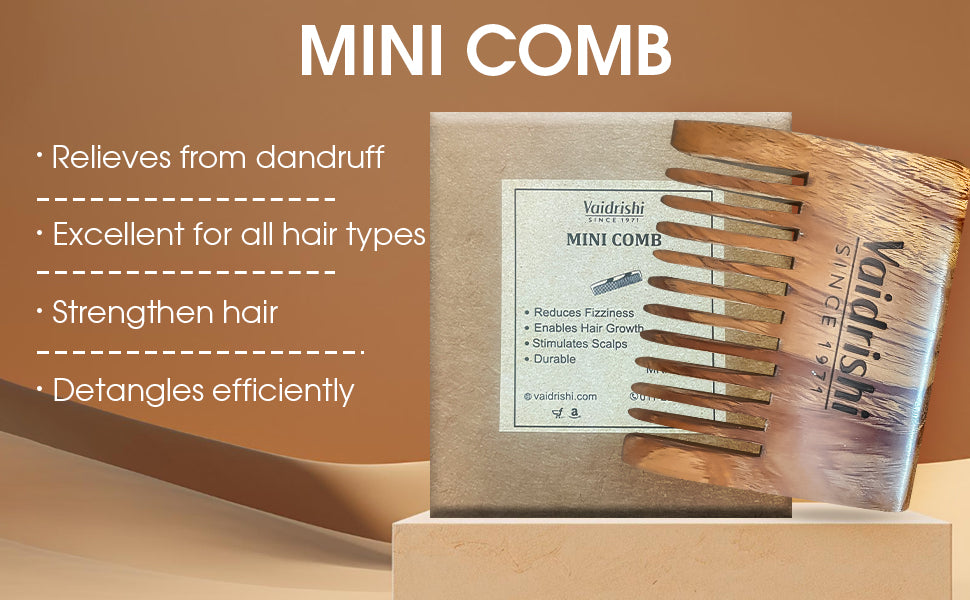 Introducing the Vaidrishi Bamboo Mini Comb. Handcrafted with natural antibacterial properties, it relieves dandruff and is excellent for all hair types. The wide-toothed shape facilitates detangling. Non-static, environmentally sustainable, and manufactured from leftover bamboo timber. A simple, ecological option for hair care.