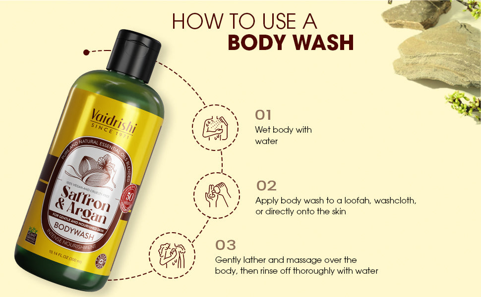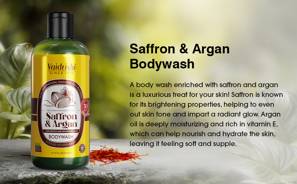 Using a body wash infused with argan oil and saffron offers a multitude of benefits for the skin. Firstly, argan oil deeply moisturizes the skin, keeping it hydrated and supple. This helps prevent dryness and flakiness, leaving the skin feeling soft and smooth. Additionally, saffron's antioxidant properties help protect the skin from damage caused by free radicals, promoting a youthful and radiant complexion. The combination of these two ingredients helps nourish and rejuvenate the skin, leaving it looking healthy, vibrant, and glowing. Moreover, the luxurious scent of saffron adds a sensory element to the body wash, providing a spa-like experience with every use. With decades of experience in Ayurveda, Vaidrishi ensures the highest quality formulations for your skincare needs.