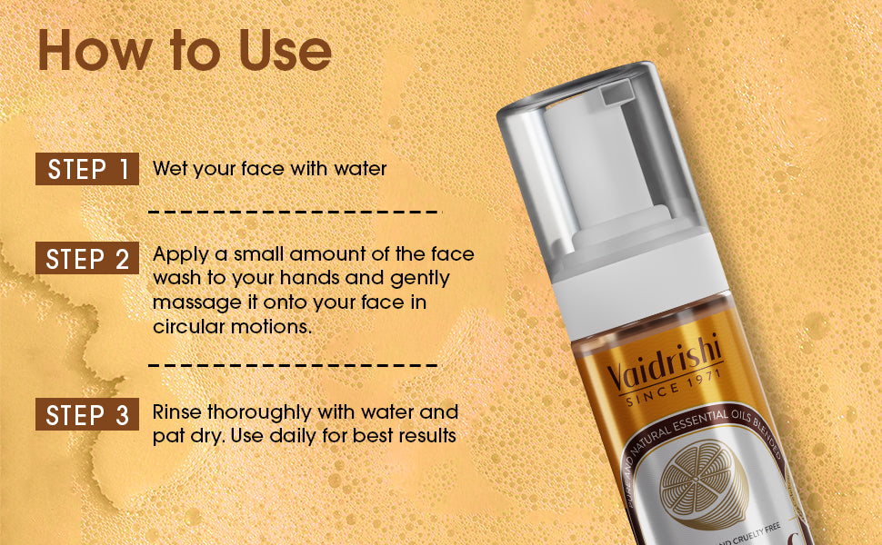 To use Vaidrishi Vitamin C Facewash, wet your face, apply a small amount onto your palm, and gently massage it onto your damp skin using circular motions. Avoid the eye area. After massaging for 1-2 minutes, rinse thoroughly with lukewarm water and pat dry with a clean towel. . We recommend following this routine twice a day for the best results.