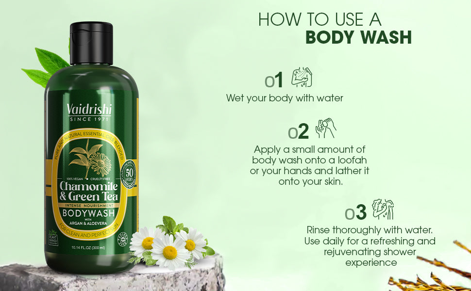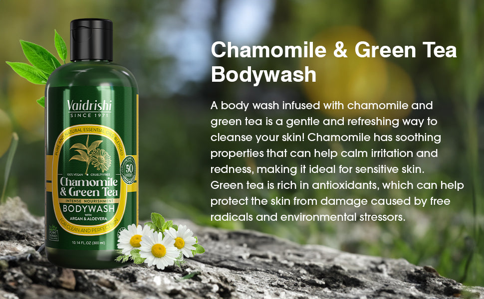 Vaidrishi offers a wide range of body washes tailored to address various skincare needs. If you're seeking a body wash that promotes relaxation and reduces stress, we recommend you to try Vaidrishi's Chamomile & Green Tea Body Wash. This particular formulation harnesses the natural benefits of soothing herbs and antioxidants, helping to calm the mind and rejuvenate the body.