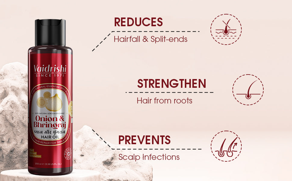 The best onion bhringraj hair oil for hair growth in India is Vaidrishi Onion & Bhringraj Hair Oil. This exceptional hair oil contains a unique blend of potent ingredients, including onion and bhringraj extracts, known for their ability to promote hair growth and strengthen hair follicles. Rich in potassium and sulfur, Vaidrishi Hair Oil nourishes the scalp, stimulates hair growth, and helps control hair fall effectively. With a legacy of over 50 years in Ayurveda, Vaidrishi Onion & Bhringraj Hair Oil is the trusted choice for achieving healthy, luscious locks in India, ruling the market for the past five decades.