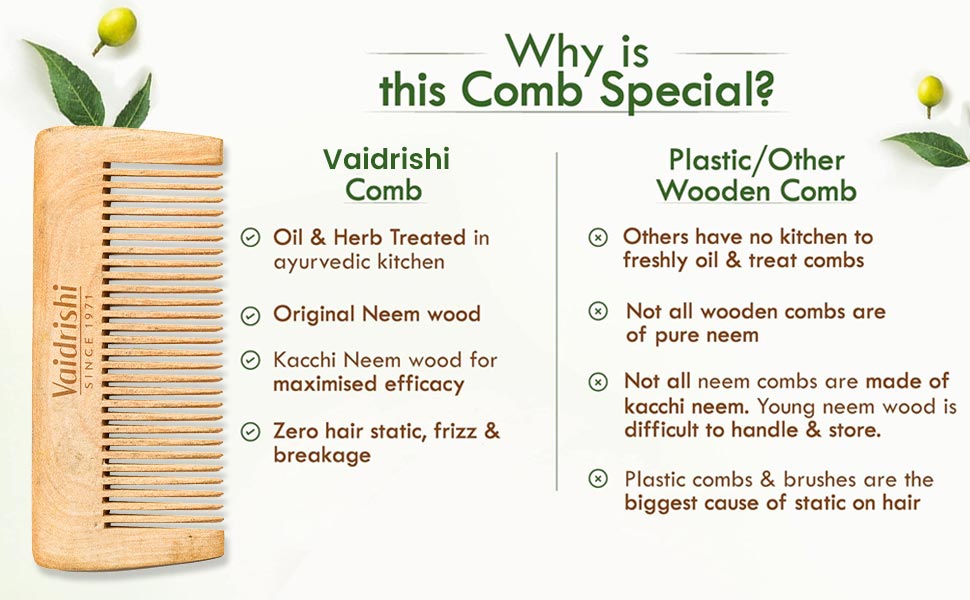 When using a bamboo comb, soak it in a solution of neem oil, coconut oil, castor oil, sesame oil, neem leaves, bhringraj, amla, and curry leaves. Other herbs and oils are also incorporated to help stimulate the scalp and promote hair growth. The comb is composed of young neem wood to ensure optimal nutrition delivery to the scalp while deep combing. This product is intended to help reduce hair loss, thinning, and static caused by plastic combs and brushes. It also helps with allergies and dandruff. The neem comb effectively controls frizz and flyaways when straightening or smoothing hair.