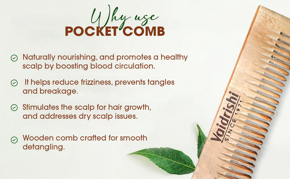 Discover the convenience of the Vaidrishi Pocket Wood Comb, crafted for smooth detangling on the go. This travel-friendly, pocket-sized comb is gentle on hair, naturally nourishing, and promotes a healthy scalp by boosting blood circulation. Ideal for all hair types, it helps reduce frizziness, prevents tangles and breakage, stimulates the scalp for hair growth, and addresses dry scalp issues.