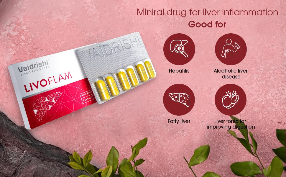 Vaidrishi Livoflam Capsules reduces liver inflammation, protects liver cell membranes, and prevents fat accumulation. It also supports detoxification and recovery from liver damage caused by toxins and infections.